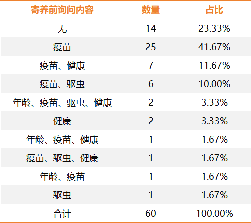 线下体察发现,在60家体察机构中,有14家机构未询问任何宠物相关情况,25家机构仅询问单一疫苗项。询问流程不规范,无法全面掌握宠物健康情况,或增加寄养宠物染病风险,无法满足消费者对于高品质寄养服务的期望。