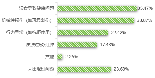 问卷调查显示,在宠物食品方面,仅有25.57%的受访者表示其宠物在食用后未出现任何异常;其余反馈中,39.45%的受访者遇到宠物“食欲减退”,30.29%发现“毛发问题”,27.27%反映出现“皮肤过敏”等。在宠物用品方面,仅23.68%的受访者未遇到过任何问题,而在出现异常的情况中,误食引发的健康问题、机械性损伤以及行为异常占比最高。