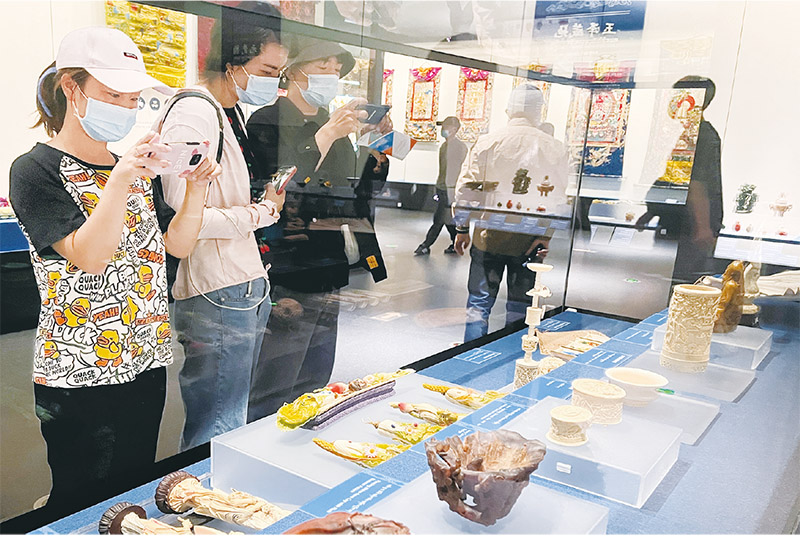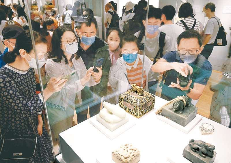 2022年7月3日,香港故宫文化博物馆正式对公众开放参观。图为观众在香港故宫文化博物馆展厅内参观拍照。 新华社记者 王申/摄