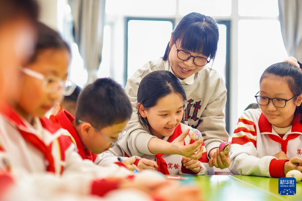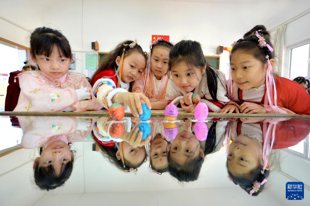 3月20日,南京白事一条龙4000253450学生们在山东青岛市实验小学开展的“传统习俗迎春分”主题活动中进行竖蛋游戏。