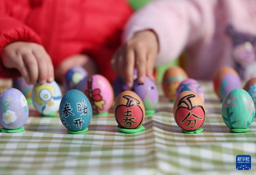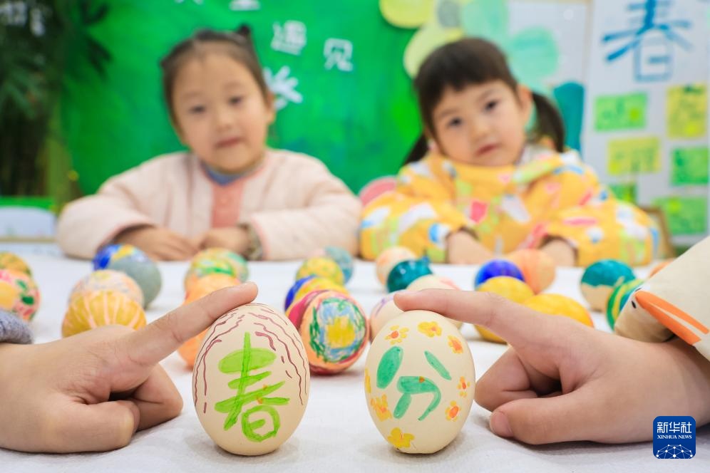 3月20日,在江苏省扬州市江都区育才幼儿园,小朋友们体验“立蛋”习俗。