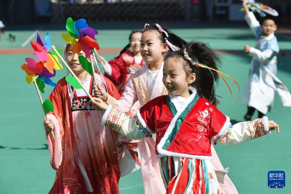 3月20日,学生们在山东青岛市实验小学开展的“传统习俗迎春分”主题活动中进行转风车游戏。