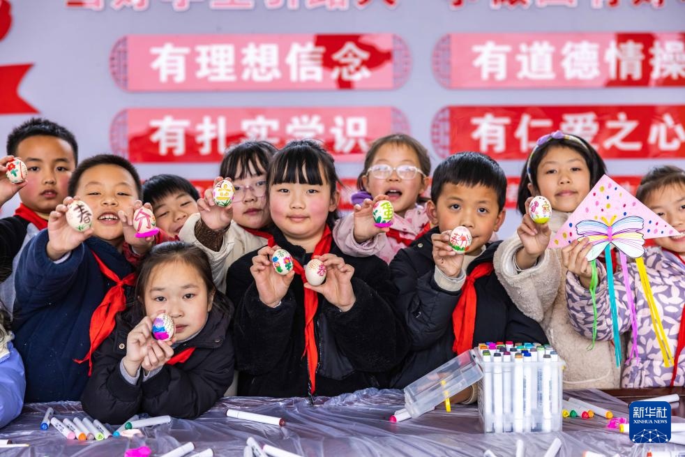 3月20日,浙江省湖州市德清县乾元镇第一幼儿园的孩子们展示他们描绘的彩蛋。